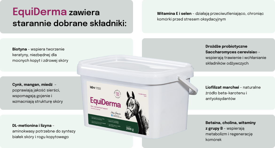 Opinie o Lab-v EquiDerma - Mieszanka paszowa uzupełniająca dla koni i kucyków wspierająca kondycję skóry, sierści i kopyt 2000g