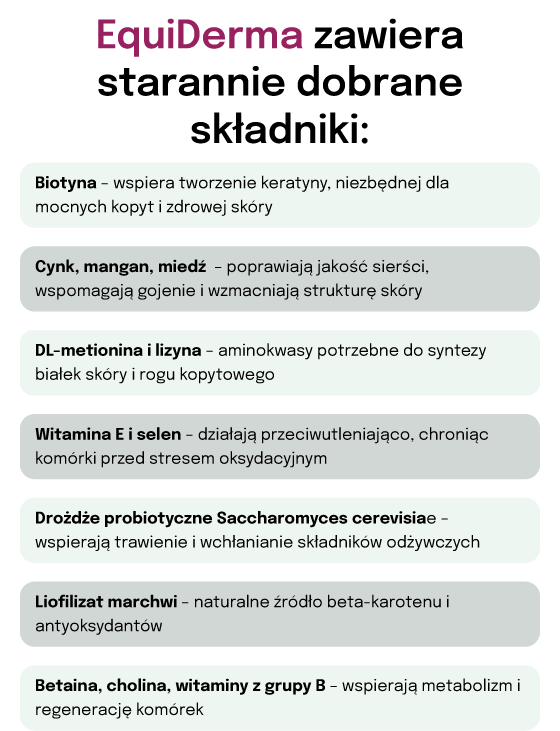 - ✅ Wzmocnienie struktury kopyt – biotyna, cynk i metionina wspierają ich prawidłowy wzrost