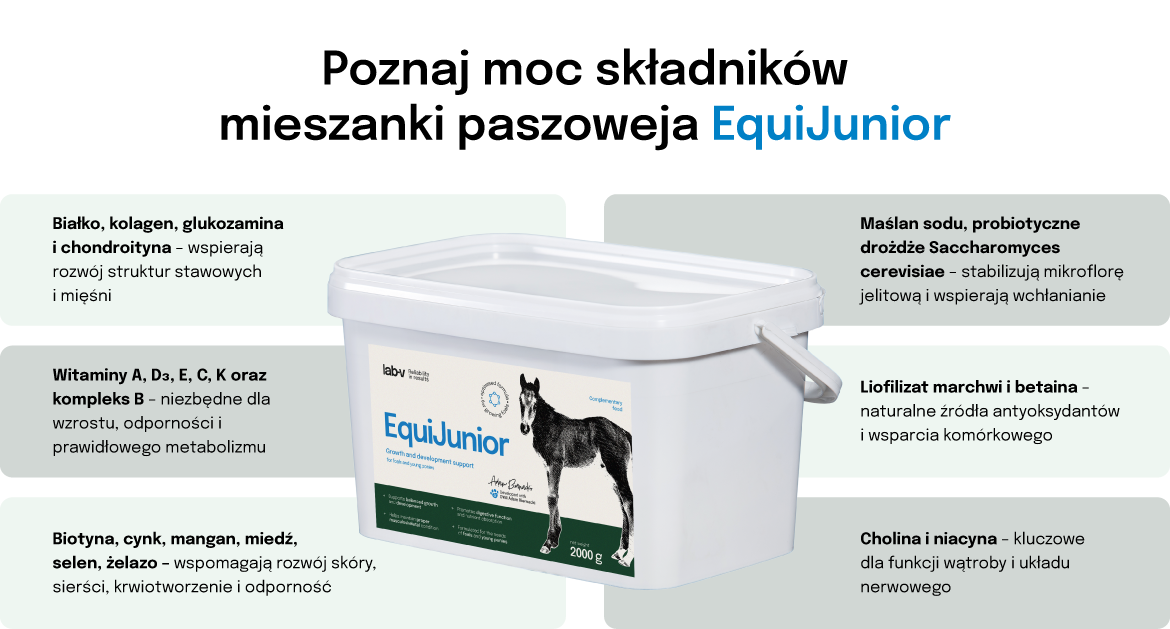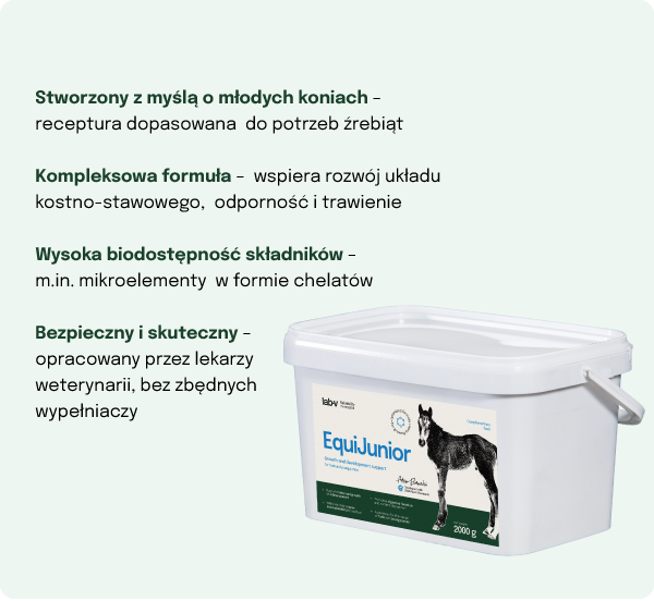 Lab-v EquiJunior - Mieszanka paszowa uzupełniająca dla źrebiąt, wspierająca wzrost, rozwój i prawidłowe żywienie młodych koni i kucyków 2000g