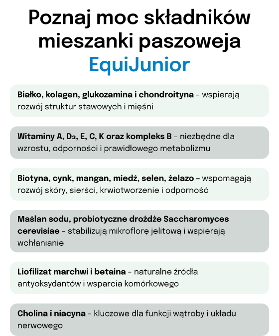 • Koni potrzebujących wsparcia rozwoju układu kostnego i stawowego.