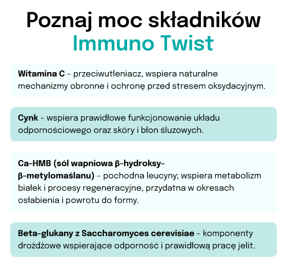 Immuno Twist dostarcza witaminę C i cynk – niezbędne w prawidłowym funkcjonowaniu układu odpornościowego – oraz HMB, które wspiera przemiany białek i powrót do dobrej kondycji. Obecność komponentów drożdżowych S. cerevisiae sprzyja równowadze jelitowej, co dodatkowo wspiera naturalne mechanizmy obronne.