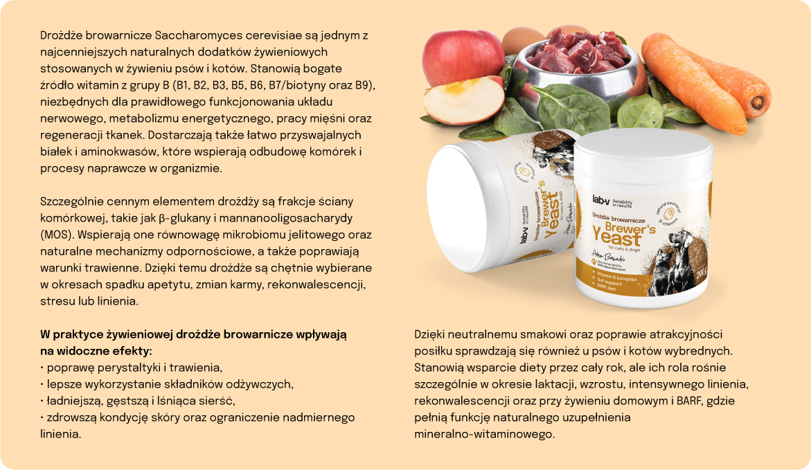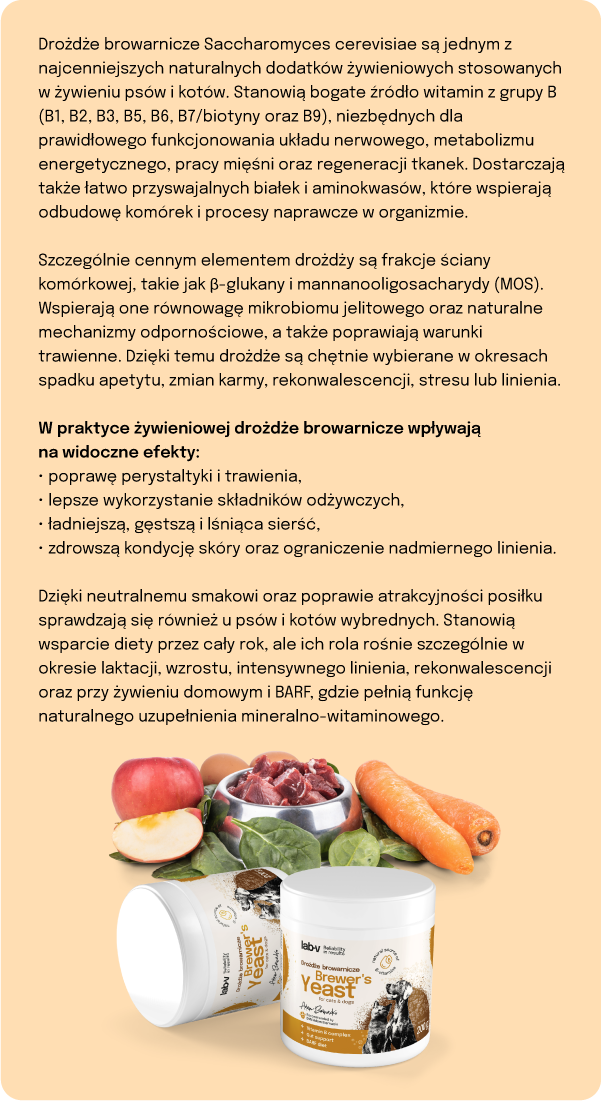 Drożdże browarnicze to jednoskładnikowy, naturalny dodatek żywieniowy dla psów i kotów, bogaty w witaminy z grupy B, aminokwasy i frakcje drożdżowe wspierające trawienie, przyswajanie i smakowitość posiłków.