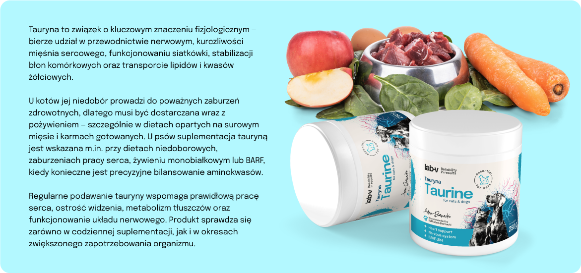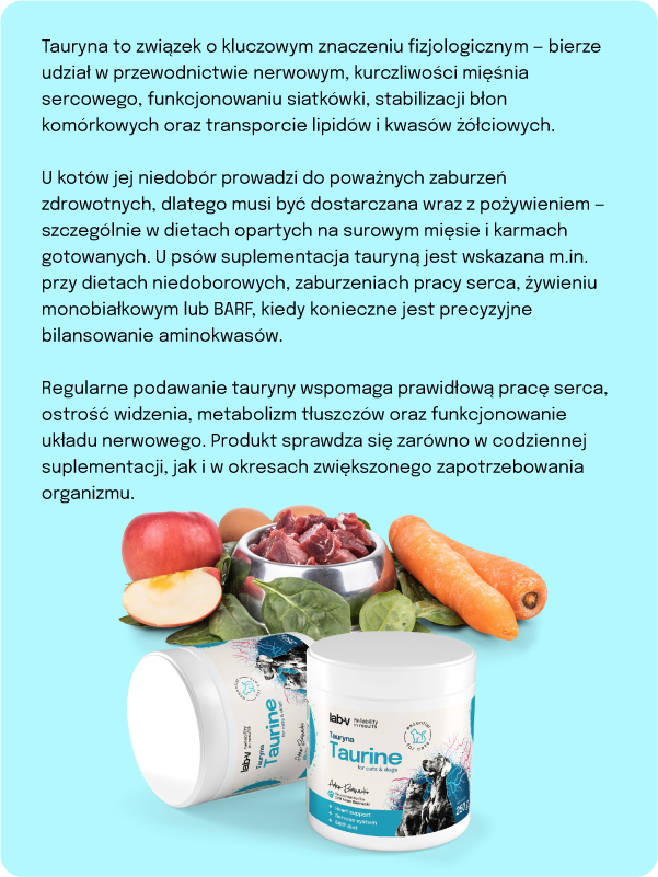Tauryna to związek aminokwasopodobny naturalnie występujący w tkankach zwierząt, niezbędny w żywieniu kotów oraz cenny dla psów w szczególnych sytuacjach dietetycznych.