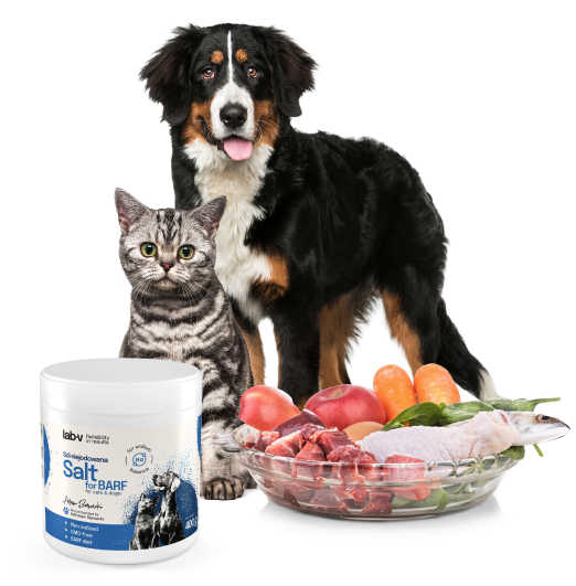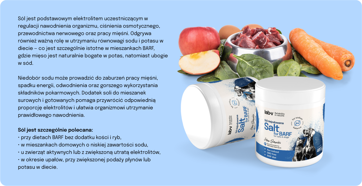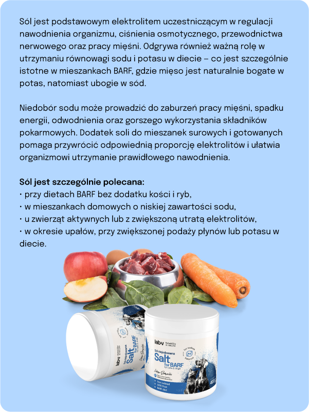 Sól jest kluczowym dodatkiem mineralnym uzupełniającym poziom sodu i chloru w diecie psów i kotów, szczególnie przy żywieniu BARF oraz posiłkach domowych o niskiej zawartości elektrolitów.