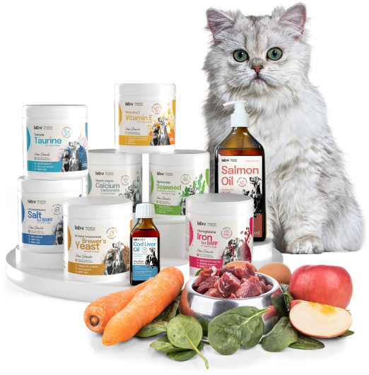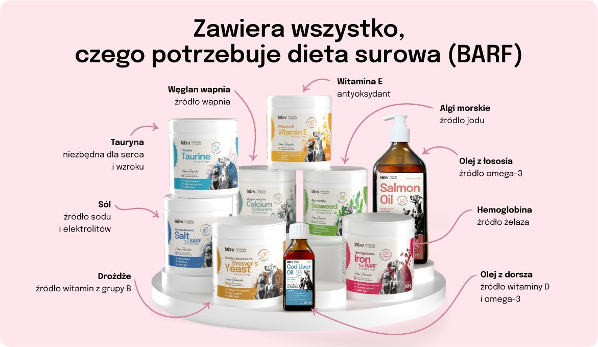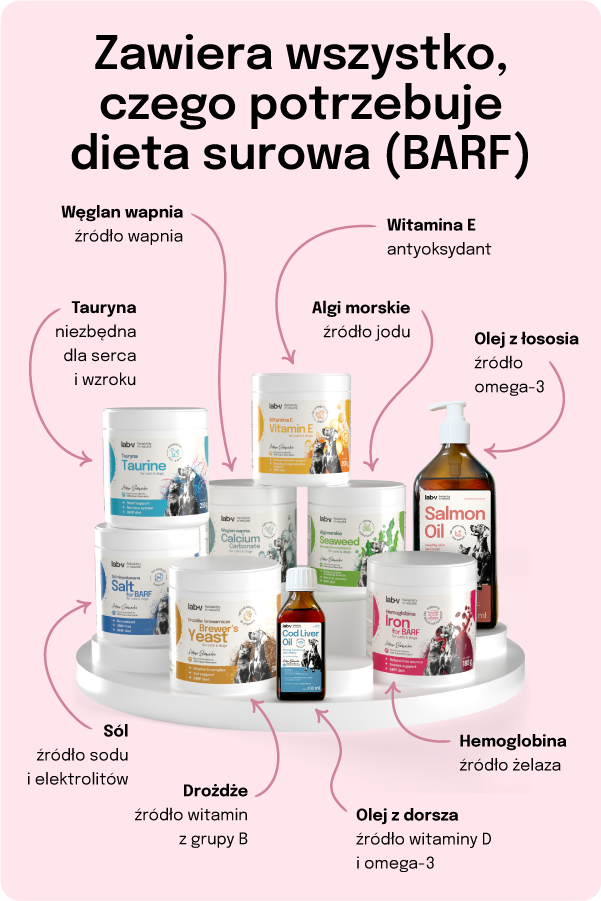 Kompletny zestaw dodatków BARF dla kotów, zapewniający prawidłowe żywienie, równowagę mineralną i wsparcie zdrowia.