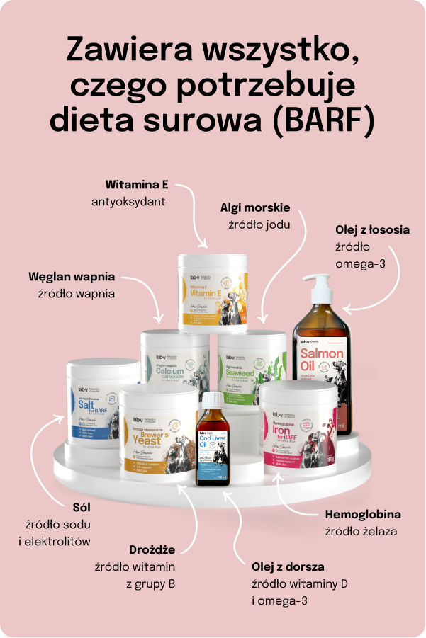 Drożdże wspierają mikrobiom, hemoglobina dostarcza żelaza, węglan wapnia dba o kości, olej z dorsza i łososia dostarczają kwasów omega, sól reguluje elektrolity, witamina E chroni komórki, a algi morskie stanowią naturalne źródło jodu — wszystko, czego potrzebuje dobrze ułożona dieta BARF.