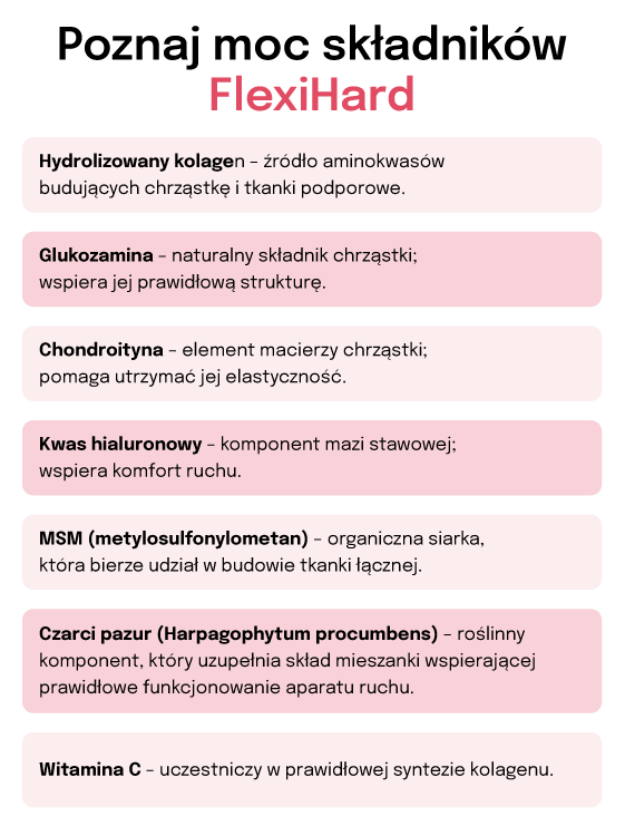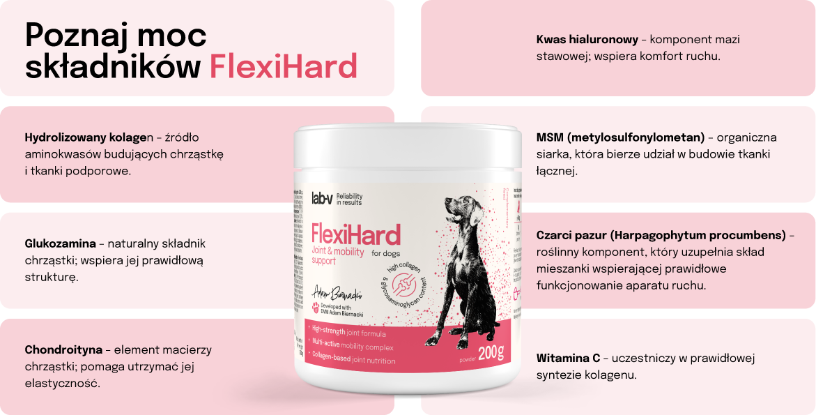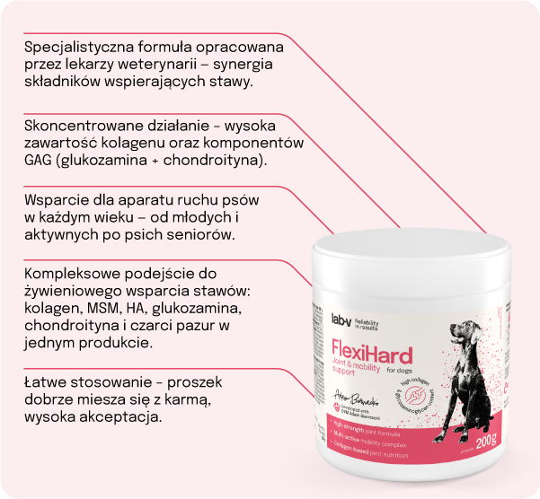 FlexiHard łączy dobrze znane, szeroko stosowane w żywieniu zwierząt składniki: kolagen, glukozaminę, chondroitynę i kwas hialuronowy oraz MSM i czarci pazur, które stanowią cenne uzupełnienie formuły wspierającej aparat ruchu.